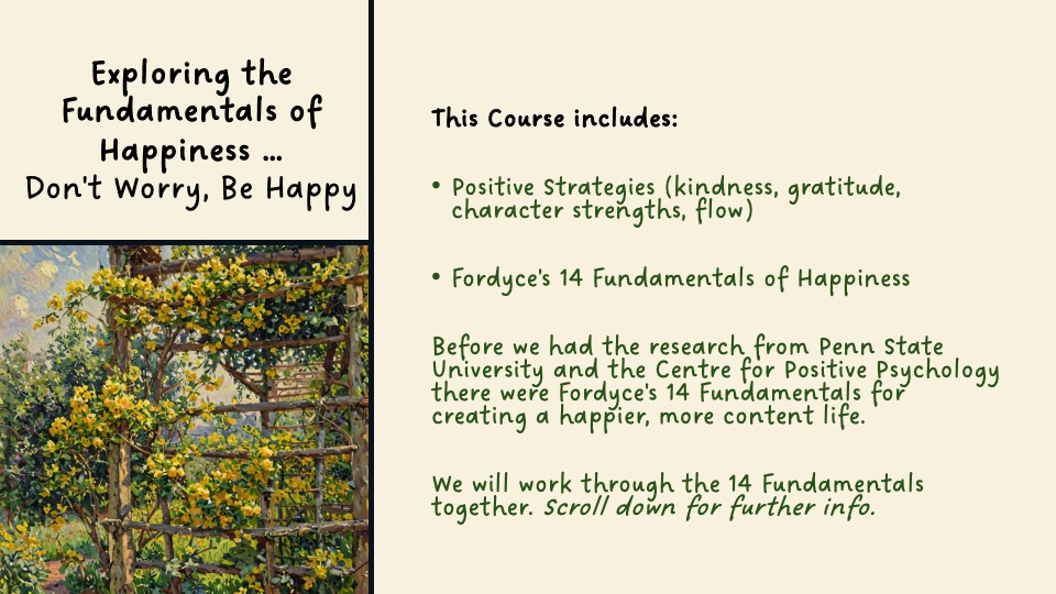 Fordyce’s 14 Fundamentals of Happiness is a structured approach to strengthening happiness levels. (Fordyce, 1983).