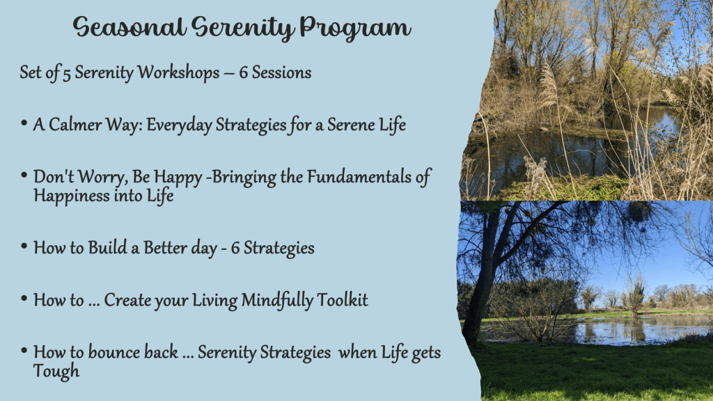 All the workshops include practical strategies (tools) which you can add to your personal ‘Toolkit’ of Serenity Strategies. This is about exploring what works for you in your life.