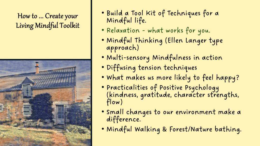 Create your own Toolk Kit or Treasure Trove of serentiy strategies for a mindful life. Focus on approaches to relaxation and what works for you.